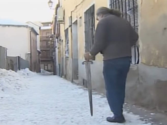 La nevada en España ha dejado momentos que quedarán para el recuerdo. Una de las últimas e insólitas imágenes es la de un vecino de Toledo que ha sido grabado caminando sobre el hielo con la ayuda de una espada, un elemento característico de esta región.