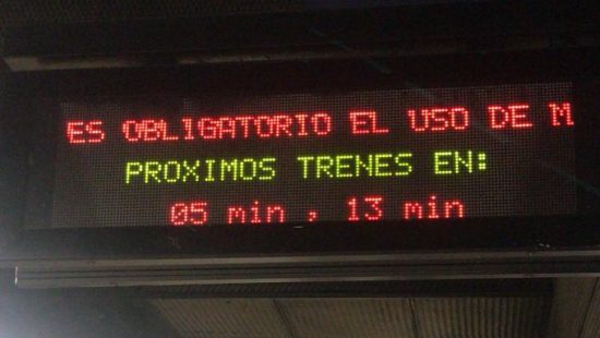 “Es obligatorio el uso de m”, se puede leer, cortando a propósito la palabra mascarilla. Junto a este mensaje, aparecen el tiempo de espera para que lleguen los dos siguientes metros al anden, el primero en 5 minutos y el segundo en13.