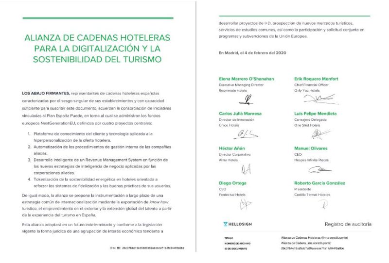 El documento de constitución de la primera alianza de cadenas hotelera españolas, está firmado por: Alma Hoteles, Castilla Termal, Fontecruz Hoteles, Hospes Hotels, One Shot Hotels, Only You Hotels, Único Hotels y Room Mate Hotels