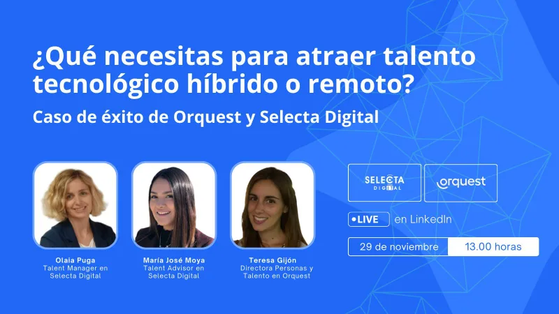 El encuentro virtual tendrá lugar el 29 de noviembre a las 13.00 horas y en él, Olaia Puga y María José Moya, expertas de Selecta Digital, abordarán los retos que presenta la selección de perfiles tecnológicos en modalidades híbrida y remota, analizando las últimas tendencias y las claves fundamentales en este ámbito. Además, el webinar contará con una invitada especial, Teresa Gijón, directora de personas y talento de la empresa de software madrileña, Orquest. Con ella, se analizarán las claves de éxito que está teniendo Orquest en la atracción de perfiles tecnológicos y digitales y cómo una consultora de selección puede ayudar a cualquier empresa a encontrar este tipo de talento tan peculiar.