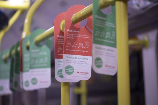 Santander ha puesto en marcha una acción de perching en la línea C03 de la EMT de Madrid, en la que regala semillas a los usuarios del transporte público eléctrico para ayudarles a mitigar su huella de carbono