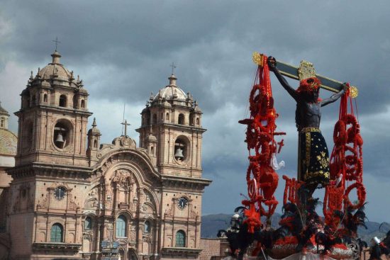 Las celebraciones comienzan con misas en quechua y cantos tradicionales al interior de la Catedral de Cusco. Luego, la imagen del Señor de los Temblores recorre las calles principales acompañada por pututeros, músicos y sahumadores, mientras los fieles lanzan pétalos de ñujchu, una flor andina con forma de cruz.