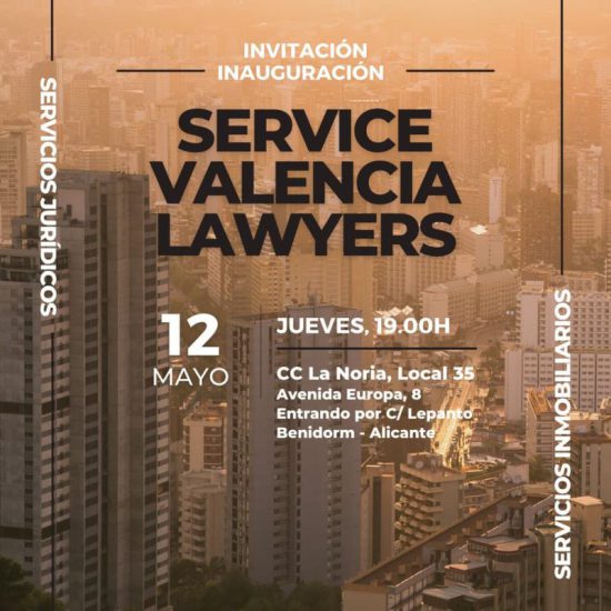 Pásate por el Centro Comercial La Noria, local número 35 (entrando por la Calle Lepanto) este jueves 12 de mayo a partir de las 19h, y disfruta de la fiesta de inauguración de Service Valencia Lawyers. Conoce a su equipo de profesionales e infórmate de todos los servicios legales e inmobiliarios que han llegado a Benidorm para revolucionar el sector.