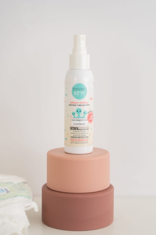 Seven Kids, la marca de perfumería y cosmética infantil especializada en el cuidado y protección de la piel de bebés y niños, sabe muy bien qué es lo que necesitan los más pequeños de la casa. Su piel es más fina y delicada, por lo que es mucho más permeable, pierde y absorbe agua con mayor facilidad y es más sensible a estímulos externos que pueden ser perjudiciales. Y especialmente la piel de la zona del pañal, que al no tener la misma transpiración del resto del cuerpo está sometida a un exceso de humedad. Estas agresiones pueden provocar sensación de incomodidad en esta parte del cuerpo del bebé, por lo que se debe prestar especial atención a la hora de aplicar un producto específico que la cuide y la proteja. Para lograr esa máxima protección y el mejor cuidado de la piel en la zona del pañal, Seven Kids ha diseñado el nuevo spray pañal con prebióticos y vitamina B3. Un novedoso producto en un formato más higiénico y fácil de aplicar que las cremas, que protege y reconforta con especial mimo la piel de esta delicada zona. Además, su fórmula vegana está enriquecida con tres principios activos COSMOS CERTIFICADOS: