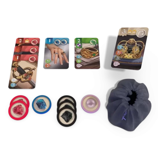 Otra acción es reservar una Carta y coger Oro: Si vemos una carta que nos interesa mucho (o que sabes que tu pareja necesita desesperadamente), puedes «reservarla». Te la llevas a tu mano y recibes una ficha de Oro, que funciona como comodín para cualquier color. Y por último, comprar una Carta de Joya: Pagaremos el coste indicado en la carta. Esa carta se coloca frente a nosotros y se queda ahí toda la partida.