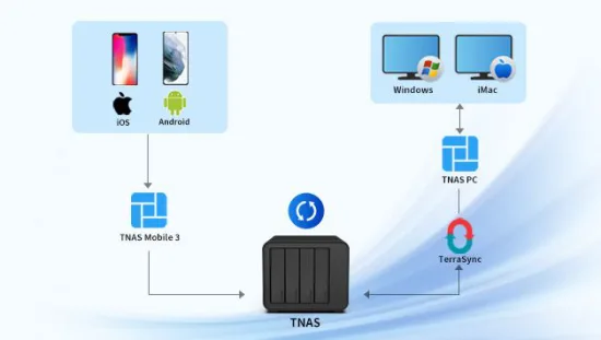 Con TNAS Mobile 3, los usuarios pueden hacer copias de seguridad de los datos de sus teléfonos en TNAS. Con el servidor TerraSync en TNAS PC, los datos de TNAS se pueden sincronizar con el ordenador, lo que permite una comunicación de datos perfecta entre dispositivos móviles, ordenadores y TNAS. La integración perfecta de TNAS PC y TNAS Mobile 3 ofrece a los usuarios una solución integral de gestión de los datos móviles. Ya sea en casa, en la oficina o de viaje, los usuarios pueden hacer copias de seguridad, sincronizar y administrar fácilmente sus datos.