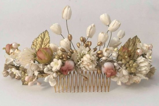 Las coronas de novia son también accesorios muy requeridos. Fernández asevera que para trabajar en estas piezas se necesita un tiempo mínimo para su elaboración. Son accesorios elaborados de forma artesanal y personalizada que requieren mucha atención al detalle, sobre todo con componentes como flores preservadas y pedrería.
