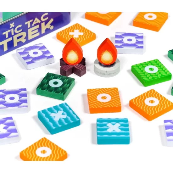 Pero esto tiene un paso extra, pues nuestro objetivo es preparar este terreno que estamos colocando, para poder “Acampar”. El corazón de Tic Tac Trek es la creación de líneas de tres símbolos iguales. Al lograrlo, podremos colocar una de nuestras seis hogueras sobre la loseta recién jugada. Aquí es donde el juego se vuelve competitivo. Una vez que una loseta tiene una hoguera, su símbolo ya no puede utilizarse para futuras líneas de tres. Esta regla nos obliga a los jugadores a expandir el mapa constantemente.