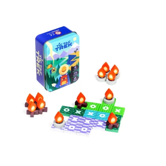 Los componentes de Tic Tac Trek , llegan presentados en una práctica lata que podremos llevarnos a todas partes (mide 9,5×6,4×3,5 cm y pesa 100gr). Son una declaración de intenciones de que no necesitas mucho espacio, ni un gran despliegue, para pasarlo bien. Se compone de 26 losetas de terreno que incluyen montañas, desiertos, praderas, bosques y lagos. 12 hogueras, divididas en dos formas (el círculo «O» y la cruz «X»). Y 1 bolsa de tela, esencial para la mecánica de robo aleatorio.