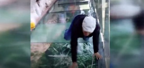Un turista vivió una pesadilla al quedarse atrapado en un puente de vidrio que terminó parcialmente destruido tras un vendaval en un resort al norte de China.