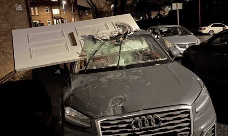 Ashworth Rd, Dewsbury – Driver collided with a vehicle, then the front porch of a house – before then continuing to drive for several metres with front door attached to car. Driver arrested suspected unfit through drink/drugs. #wypthecost #fatal4 pic.twitter.com/ee8r9ZZc9A