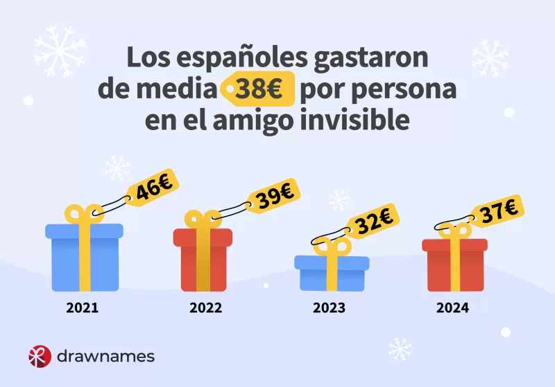 La media de gasto en el amigo invisible en España para 2024 es de 37 € por persona, una recuperación significativa respecto a los 32 € de 2023. Entre 2021 y 2024, dicha media fue de 38,5 € por persona.