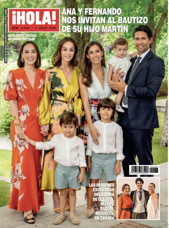 ¡Hola! lleva dos acontecimientos muy felices en su portada: en primer término, el bautizo de Martín, el hijo menor de Ana Boyer y Fernando Verdasco. En la foto vemos a la pareja con el niño en brazos, sus otros dos hijos, e Isabel Preysler y Tamara Falcó, madre y hermana de Ana Boyer, respectivamente. El otro tema es la boda de Claudia, hija mayor de Raquel Revuelta, celebrada en Zahara de los Atunes (Cádiz).