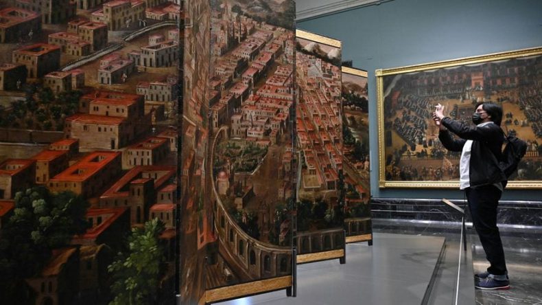 Por un lado la apacible vida de la ciudad de México vista desde las alturas y, por otro, la encarnizada lucha por el control de la ciudad de Tenochtitlán: el Museo del Prado muestra un excepcional biombo del siglo XVII como obra invitada para acercar al visitante el desconocido arte americano de la época.