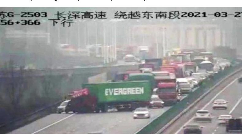 Un camión de Evergreen, misma empresa propiedad del barco que estos días ha encallado en el Canal de Suéz, bloqueó este sábado una carretera de Nanjing (China), tras un accidente de tráfico.