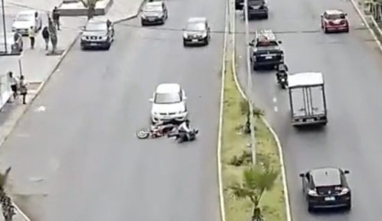 Es entonces cuando un vehículo blanco que había quedado detenido detrás de la motocicleta avanza a gran velocidad en dirección hacia los criminales y los arrolla. Ambos caen al pavimento y tratan de huir corriendo, mientras uno de ellos intenta recoger el botín del suelo.