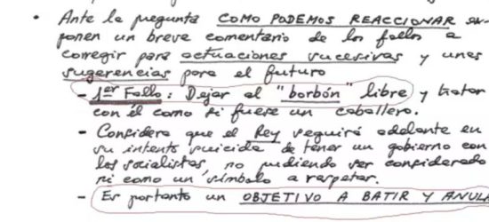 En el citado escrito exponen cómo pueden reaccionar ante los «fallos» que tienen que «corregir para «actuaciones sucesivas» y también apuntan unas «sugerencias para el futuro» y en entre ellas señala como el «primer fallo» haber dejado al «Borbón libre y tratar con él como si fuera un caballero».