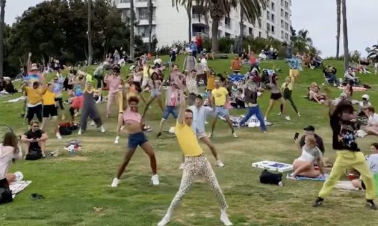Los visitantes de un parque en Santa Monica (California, Estados Unidos) fueron sorprendidos con una actuación multitudinaria para celebrar el solsticio de verano al ritmo de ‘Around the World (La La La La La)’ de ‘A Touch of Class’.