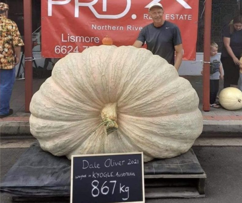 Dale Oliver, de Knockrow, Nueva Gales del Sur, se presentó con su enorme fruta en el concurso Summerland Pumpkin Competition, que premia a las mayores calabazas labradas en la región. Tras tasarla, la calabaza de Oliver superó el anterior récord establecido establecido por é mismo en 742,98 kilos.