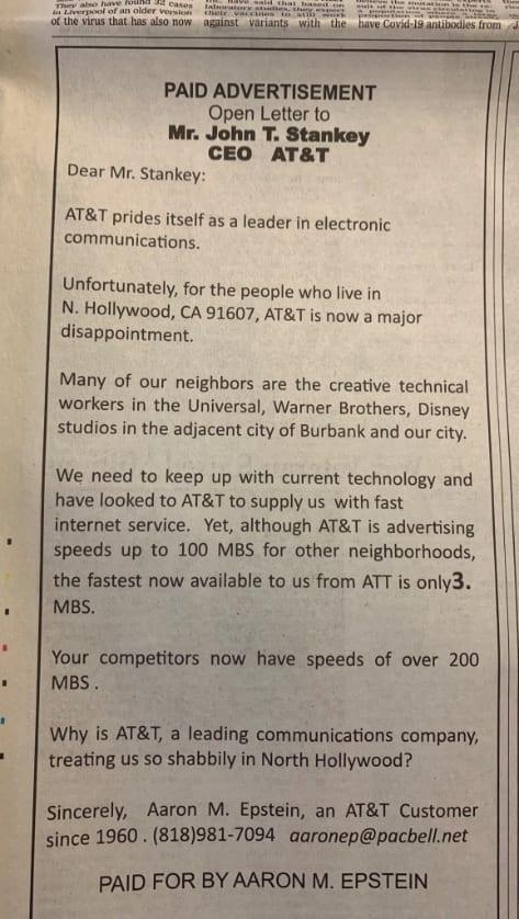 Aaron Epstein, de 90 años, cargó contra la compañía AT&T, un gigante de la telecomunicaciones en los Estados Unidos, y publicó un par de anuncios quejándose de su servicio.