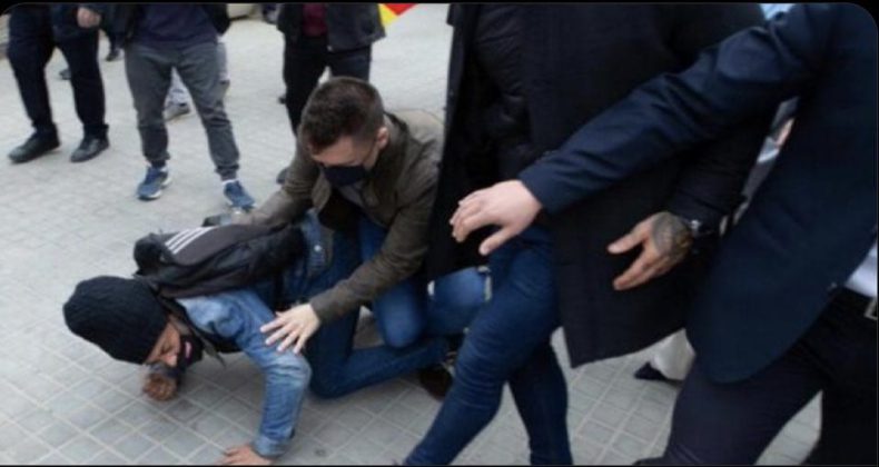 Los guardaespaldas que acompañaban a los líderes de Vox han tirado al suelo al hombre, que se había colado entre la gente concentrada para arropar a estos líderes políticos, en la primera legislatura en la que Vox tiene representación parlamentaria.