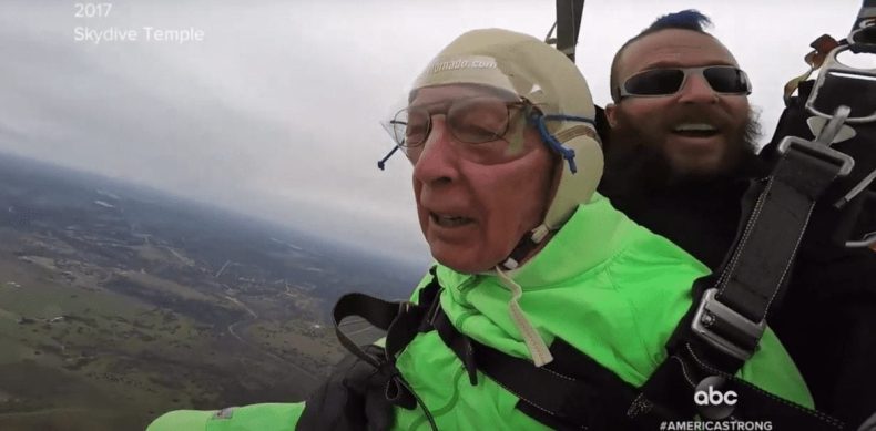 El audaz centenario se precipitó al vacío desde una altura de 14.000 pies junto al instructor Don Cameron. Ambos, antes de tomar tierra de manera segura, disfrutaron de una caída de más de 5 minutos.