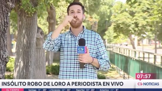 El video se ha vuelto viral en redes sociales y muestra al periodista Nicolás Krumm de la cadena CHV grabando un despacho sobre inseguridad en el sector. En las imágenes se puede apreciar como un loro se posa sobre su hombro izquierdo y, cuando menos se lo espera, con el pico le roba un audífono.