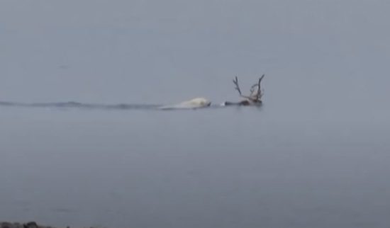 Una osa polar fue grabada dando caza a un reno en las gélidas aguas del Ártico, una inusual imagen ya que este tipo de animales no forma parte de su dieta alimenticia.