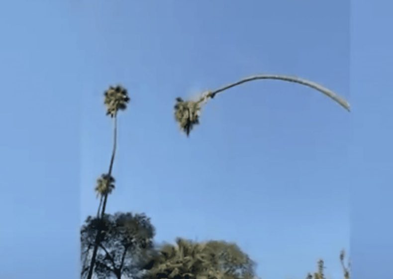 En un vídeo que se ha viralizado en las redes sociales se ve al trabajador colgado a gran altura en uno de los extremos del árbol, que permanece doblado por el exceso de peso. Cuando las ramas se desprenden de la copa, la palmera se catapulta de manera violenta con el trabajador asido al tronco.