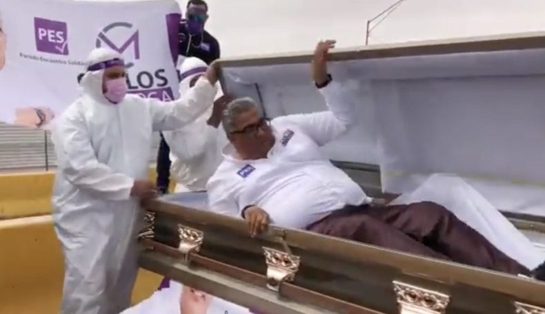 El candidato a diputado federal en Ciudad Juárez (México), Carlos Mayorga, inició su campaña electoral este martes dentro de un ataúd para concienciar sobre elevado número de muertos que ha dejado la pandemia del coronavirus y la violencia ligada al crimen organizado en el país azteca.