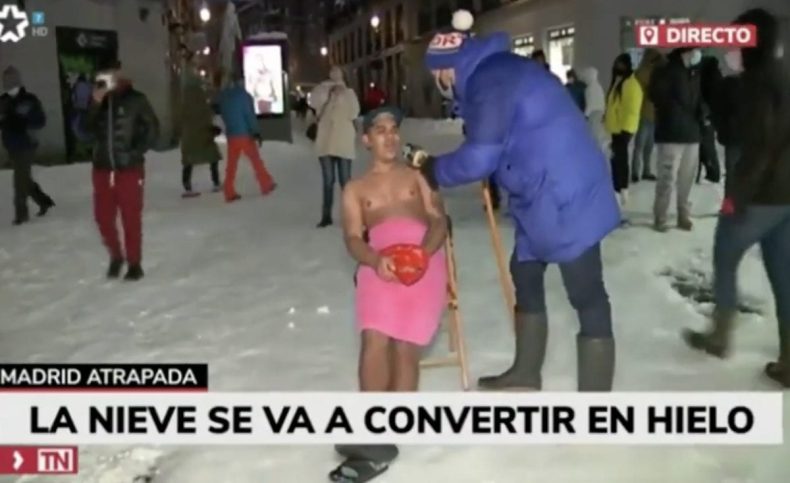 Un reportero de Telemadrid que se encontraba informado de las consecuencias del temporal ‘Filomena’ desde la Puerta del Sol de Madrid se acercó a un vecino que combatías las gélidas temperaturas de una manera muy particular.
