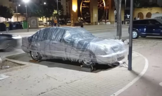 Una persona en Málaga preparó su coche para que la DANA no pudiera causarle daños. Además de envolverlo en papel transparente, el dueño amarró su automóvil a una farola para impedir que una posible riada lo arrastrase por las calles.