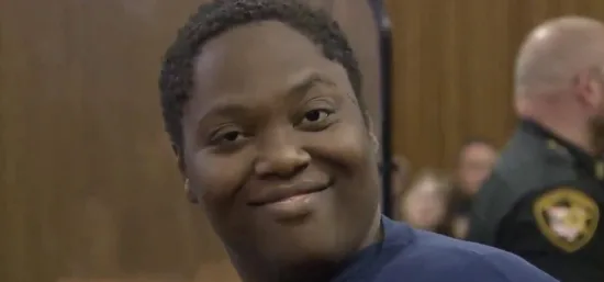 Bionca Ellis, mujer acusada de apuñalar hasta la muerte a un niño de 3 años en el parking de una tienda de comestibles en Ohio (EE.UU.), sonríe y se ríe mientras le leen los cargos.