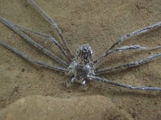 La araña pasó unos 30 minutos bajo el agua. Mientras estaba sumergido, mantuvo una «película» de aire sobre todo su cuerpo. Swierk y sus colegas sospechan que los pelos peludos que cubren su cuerpo le ayudan a mantener esta película de aire, lo que ayuda a prevenir la pérdida térmica bajo el agua, o a evitar que el agua entre en los órganos respiratorios de la araña.
