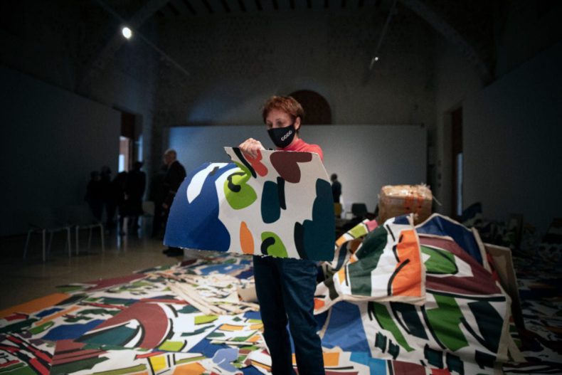 La sala Refectorio del Centre del Carme de València ha acogido una particular muestra de estas obras, tiradas en el suelo y apoyadas en las paredes, que la propia artista y varios galeristas y amigos han pisado, rasgado y pintado.