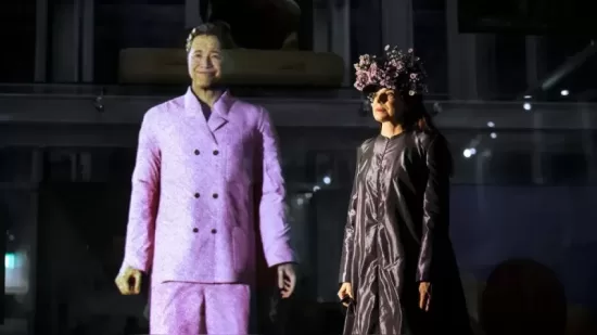 La artista lleva una corona de flores sobre la cabeza, y la capa del vestido recoge un poema generado por el metahumano “como un símbolo de esta unión artística y personal”.