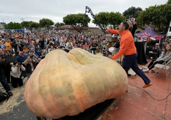 Travis Gienger de Anoka, Minnesota, ganó el 50º Campeonato Mundial de Pesaje de Calabazas en Half Moon Bay, California, con una calabaza anaranjada, enorme y abultada, de la que se podrían elaborar al menos 687 tartas.