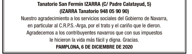 «Nuestro agradecimiento a los servicios sociales del Gobierno de Navarra, en particular al C.R.P.S.-Arga (Centro de Rehabilitación Psicosocial Arga) por el trato y el cariño que le dieron», finalizó la necrología.