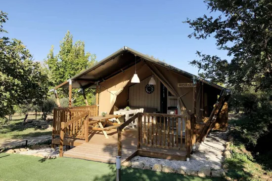 Por otro lado, las eco tents de Veragua Ocio están equipados con cocinas tipo americana completas, que incluyen nevera, vitrocerámica, microondas y menaje, y están integradas a un salón comedor. En el interior, se puede disfrutar de un baño privado y dormitorios acogedores y, en el exterior, de un porche con mobiliario, que hace que estos alojamientos sean un espacio cómodo para disfrutar del glamping en su máxima expresión.