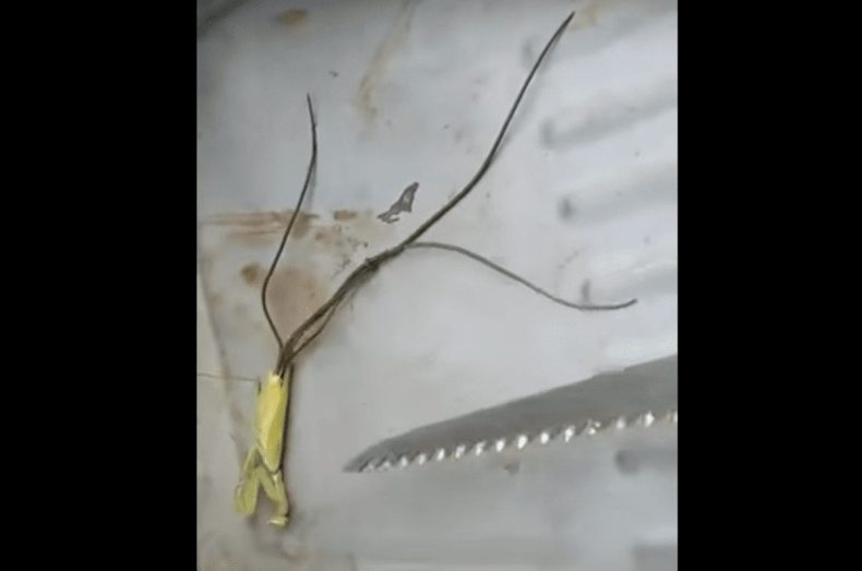 Un vídeo publicado en la red social Reddit ha revuelto el estómago a más de un usuario. En sus imágenes se puede apreciar como del cuerpo sin vida de una mantis religiosa sale un extraño ‘bicho’ cuando una persona corta con un cuchillo el extremo de la cola del insecto.
