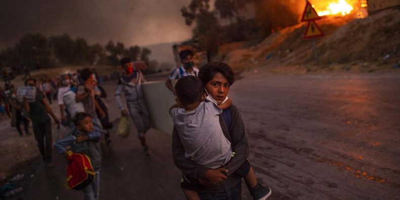 ‘Las llamas de la miseria’ es la fotografía ganadora del concurso Foto del Año UNICEF 2020. La imagen, del fotógrafo griego Angelos Tzortzinis, muestra el éxodo de los niños del campo de refugiados en llamas de Moria, en la isla griega de Lesbos. Es un momento congelado en el tiempo que captura la valentía e incredulidad de los niños y su disposición a ayudar a otros ante una gran adversidad.