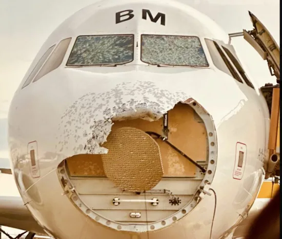 «Según la información actual, las dos ventanas delanteras de la cabina del avión, el morro del avión (radomo) [el morro—SH] y algunos paneles resultaron dañados por el granizo».