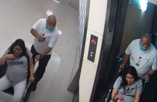 Las imágenes grabadas por a cámara de seguridad muestran al guardia Elias Davila corriendo hacia el elevador con Betzabeth, que sabía que no podría esperar más para el nacimiento de su hija Mia.