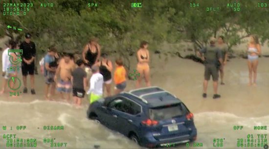 Las imágenes del helicóptero y la cámara corporal publicadas por las autoridades mostraron un vehículo azul estacionado en la playa siendo golpeado por las olas del mar.