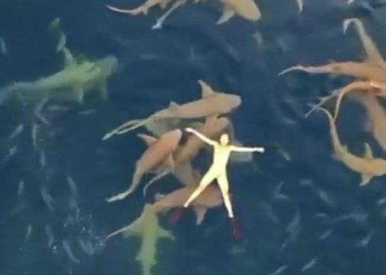 En las imagenes, se pude apreciar a la protagonista flotar despreocupada mientras decenas de escualos pasan a su lado.
