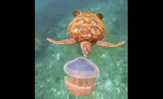 Por esta tortuga que se puso a morfar a una medusa en el agua. La hizo pedazos a la pobre medusa, qué manera de comer la hija de re mil puta.