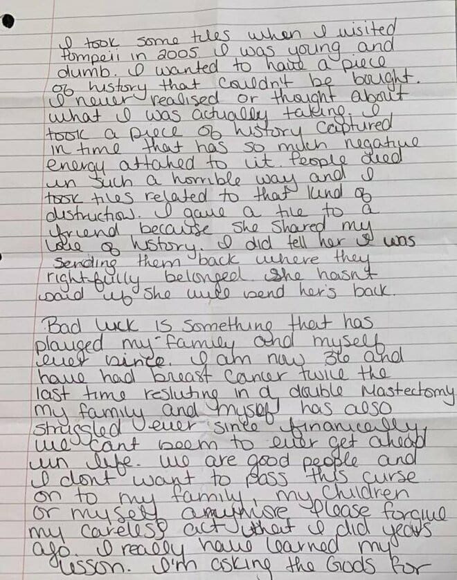 En la misiva, firmada con el nombre de Nicole, se explica que la mujer visitó el Parque Arqueológico de Pompeya hace 15 años, cuando era «joven y tonta». Durante su visita sustrajo partes de dos mosaicos, otras de una ánfora y una pieza de cerámica. Desde que robó los objetos, la supuesta ladrona sufrió dos cáncer de mama y aseguró que la mala suerte se instaló en su día a día. «Por favor, retírelos, traen mala suerte», escribió. También señaló que devolvía todo lo robado excepto un azulejo que regaló a un amigo.