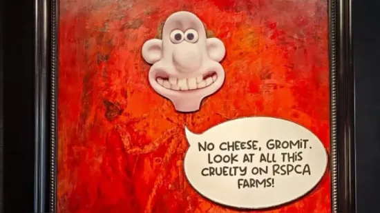 “Dado que el rey Carlos es un gran admirador de Wallace y Gromit, no podíamos pensar en una mejor manera de llamar su atención sobre las horribles escenas en las granjas con certificado de la RSPCA”, indicó Daniel Juniper, uno de los dos activistas.