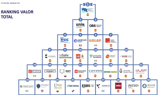 Los MBAS de la Universitat Oberta de Catalunya (UOC), Universidad de la Rioja (UNIR), OBS y Esic Business School ocupan las cuatro primeras posiciones de esta nueva edición de Ranking FSO, en la que participaron más de 200 universidades de España, Estados Unidos y Latinoamérica (México, Perú, Colombia, Argentina, Guatemala, Honduras, Guatemala y Puerto Rico).