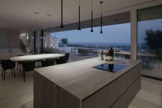 La arquitectura interior se vuelve aún más espaciosa con la utilización de ventanas panorámicas que se fusionan de manera perfecta con la naturaleza que le rodea y el fragante paisaje mediterráneo. La cálida luz reflejada crea un ambiente tranquilo y acogedor, que contrasta a la perfección con los materiales que conforman la paleta visual y táctil del proyecto.